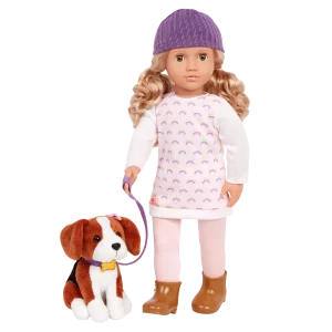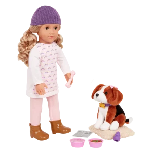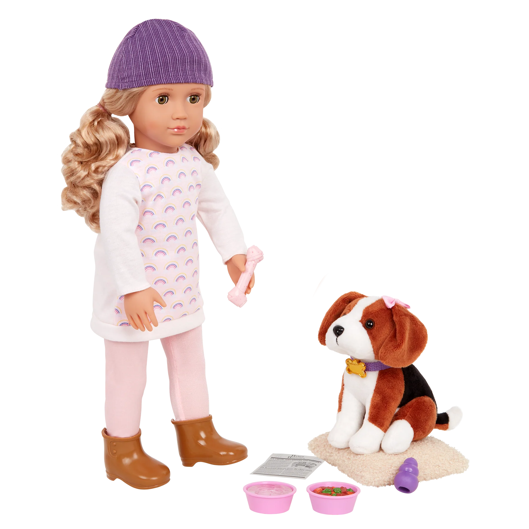 ♥ Përfshin: kukull, pelushi Beagle 6 inç me hark flokësh, kapele fasule, xhup, dollakë, këpucë, një palë pantallona, tas ushqimi, tas uji, lodër qensh, gazetë, jastëk, jakë, zinxhir të bashkangjitur dhe kockë.
