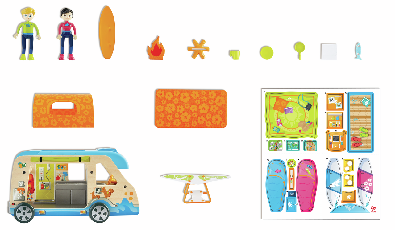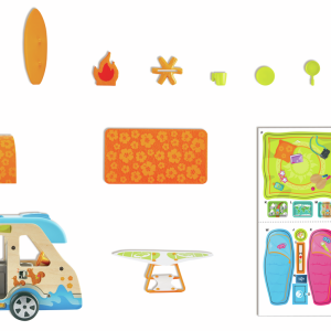 Nisuni për një aventurë të mahnitshme kampingu me piknik, surf dhe madje edhe rrëshqitje me këtë furgon kampper të shkëlqyer, të lehtë për t’u mbajtur i kompletuar me kukulla dhe aksesorë!