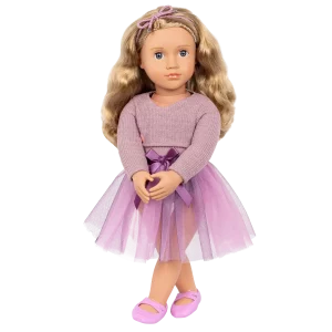Rrotullohuni dhe shkëlqeni me Savannah, kukulla balerina 18 inç e gjeneratës sonë me flokë të gjatë bjonde me onde dhe sy blu të errët që hapen dhe mbyllen!