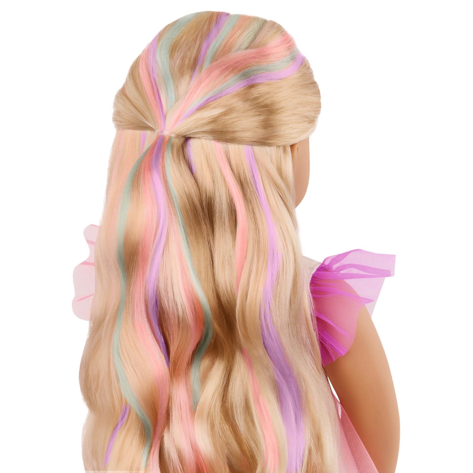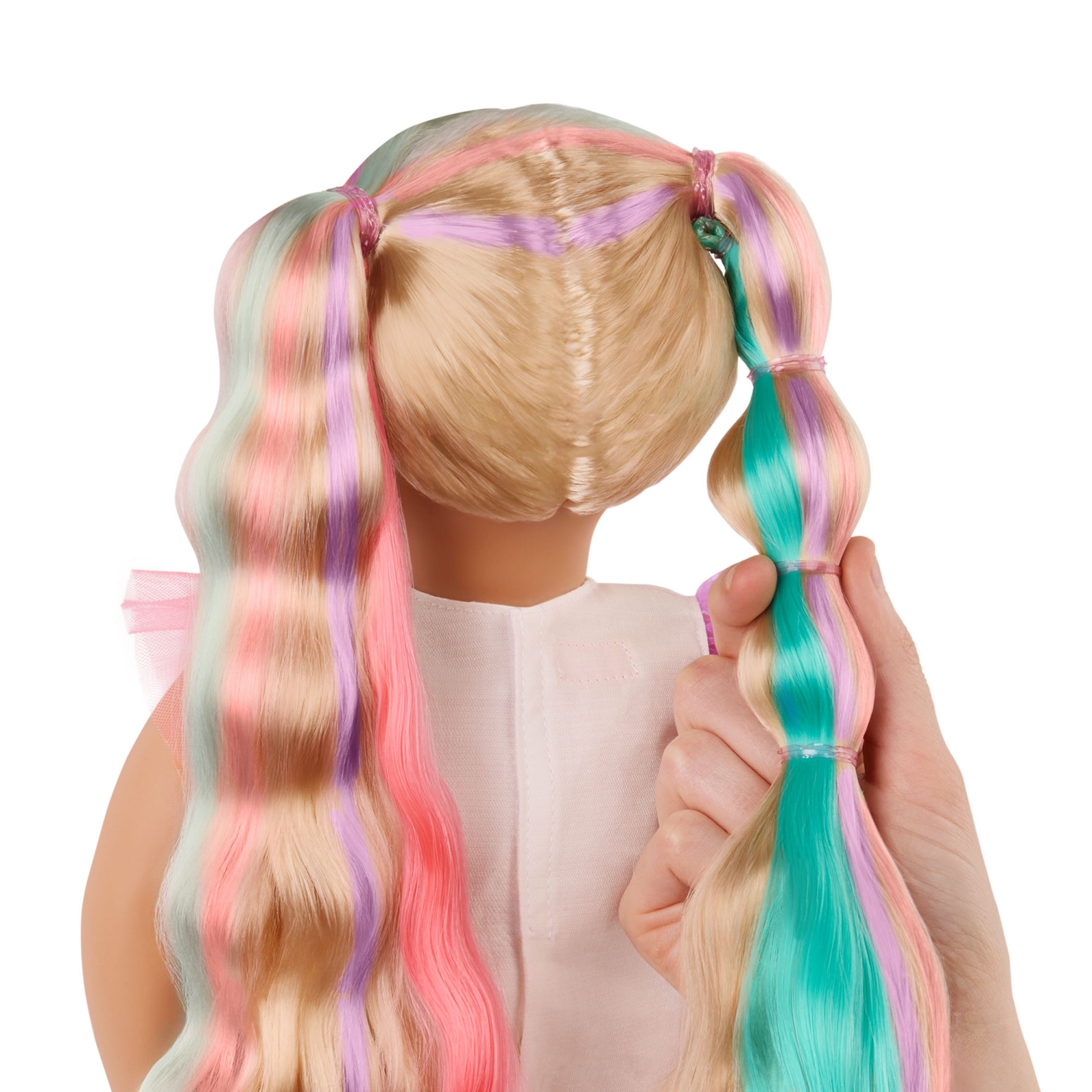 Kjo kukull 46 cm ka sy realistë lajthie që hapen dhe mbyllen, dhe flokë të gjatë (vërtet të gjatë!) ngjyrë ylberi që fëmijët mund t’i stilojnë dhe aksesojnë.