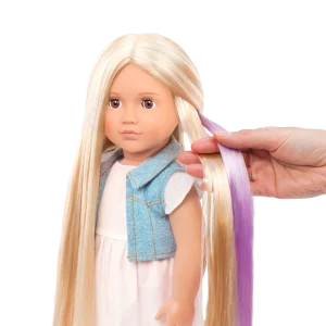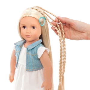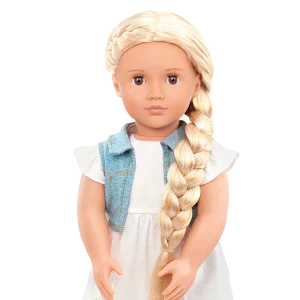 Kjo kukull e bukur 18 inç ka sy lajthie që hapen dhe mbyllen me flokë të gjatë, bjonde të lehta që janë shumë argëtuese për t’u krehur dhe stiluar!
