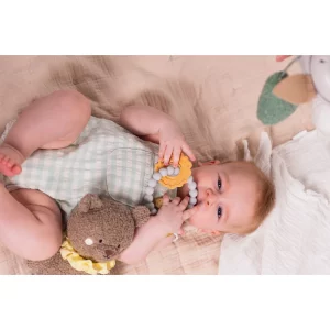 Shtoni në përzierje kukullën e ariut të përkëdhelur, shoqëruesin e parë të butë të foshnjës suaj, perfekte për përkëdhelje dhe lojë, dhe unazën shumëngjyrëshe me teksturë, e krijuar për të argëtuar dhe qetësuar mishrat e dhëmbëve të vegjël.