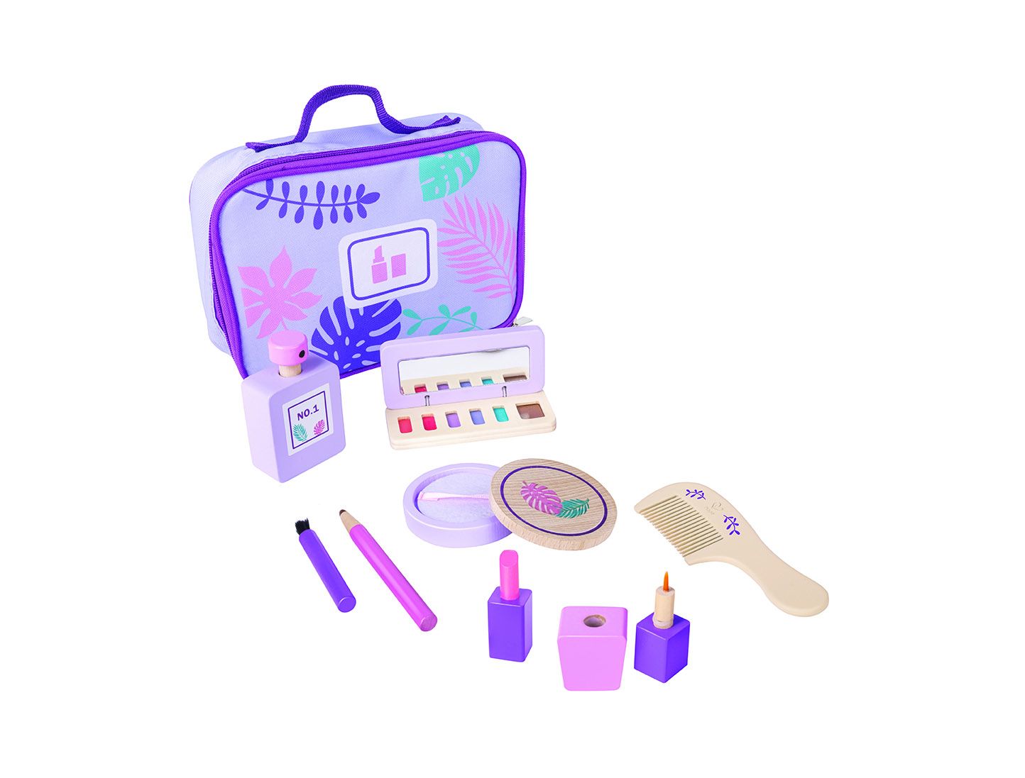 Vjen me një çantë grimi, parfum, buzëkuq, krehër, pudër fytyre me kapak, laps vetullash, manikyr me kapak, set hije dhe aplikues rimeli, të gjitha prej druri!