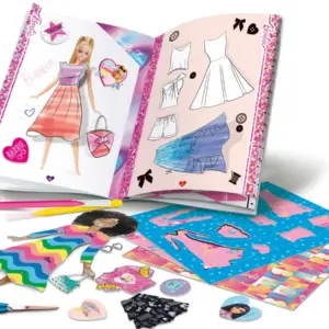 Stikera dhe ngjyra për të personalizuar çdo faqe Seti përmban stikera tematike dhe ngjyra të gjalla për të dekoruar librin e stilistit. Çdo krijim do të jetë unik dhe do të pasqyrojë personalitetin e dizajneres së vogël.