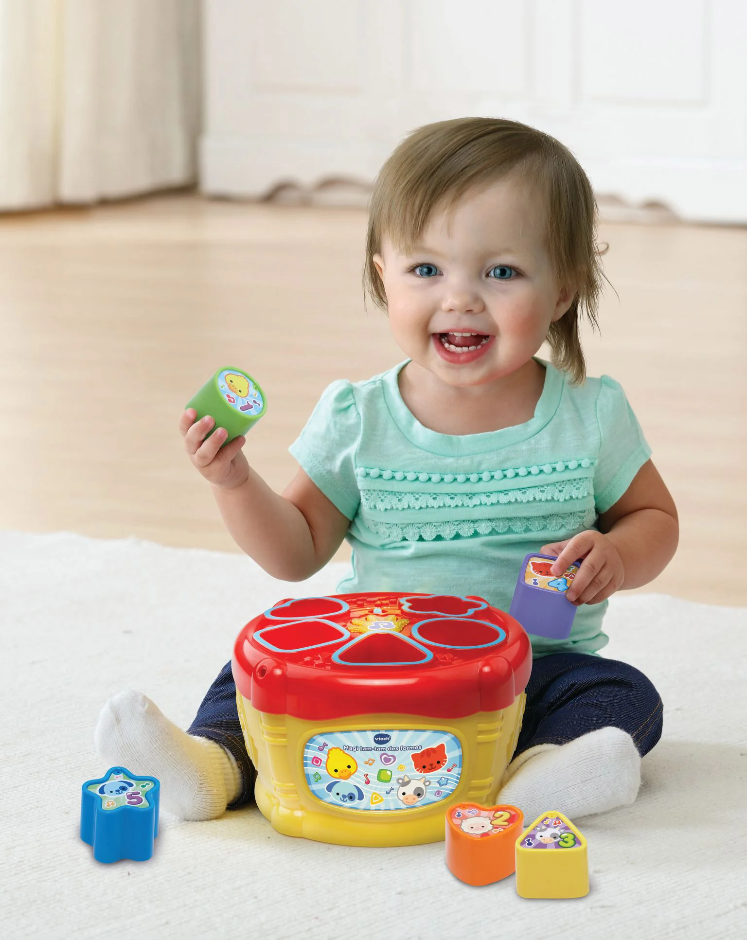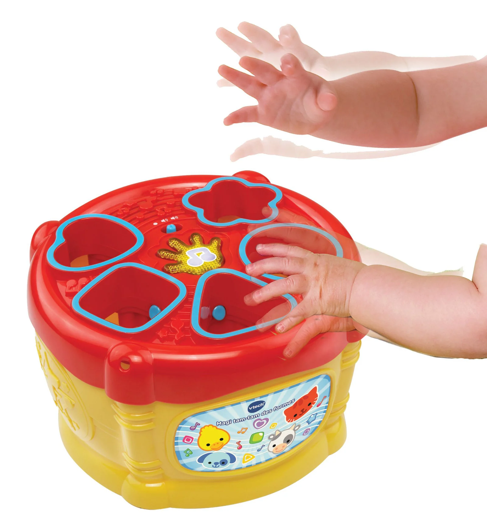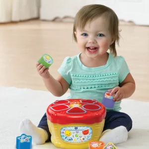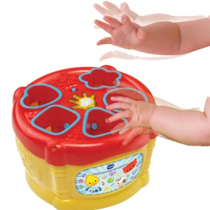Fëmija përplas duart në daulle për të aktivizuar tinguj qesharake.