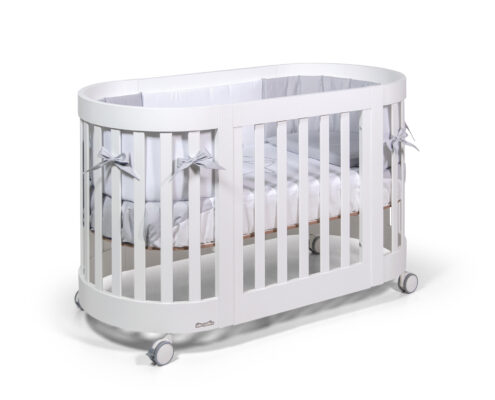 3- Duke hequr shtyllën e krevatit Dolci Notti Ovale dhe duke vendosur rrjetën në pozicionin e ulët, mund të bëhet një krevat Montessori.