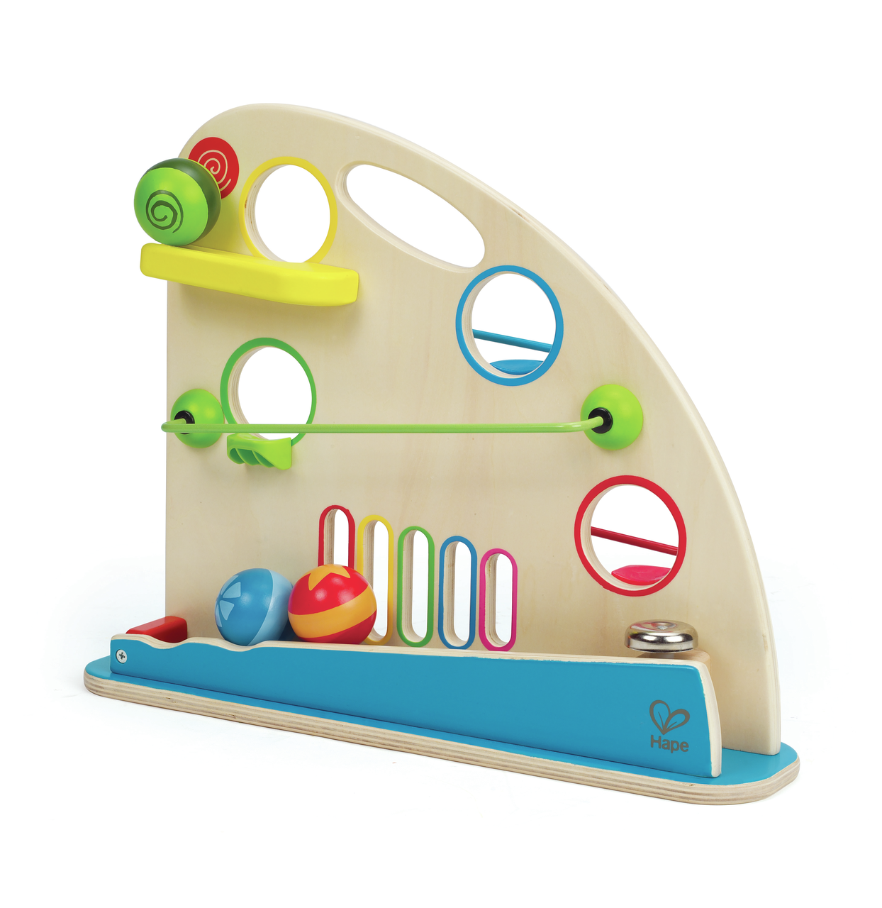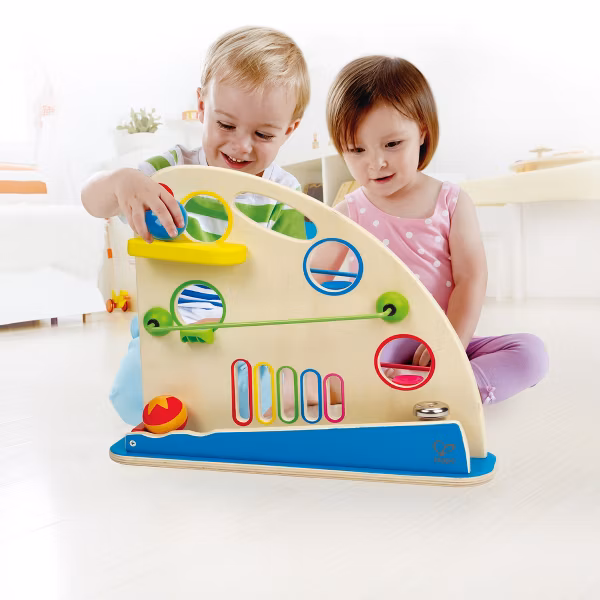 ARGËTIM I DYANSHËM: Topat shumëngjyrëshe prej druri, vrimat dhe pistat e shpejta krijojnë një mal argëtimi me dy anë që ndihmon të mësoni rreth vrullit dhe ngjyrës