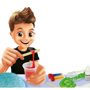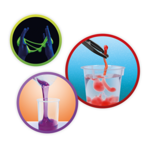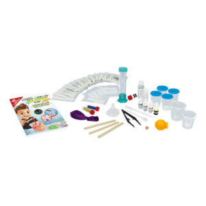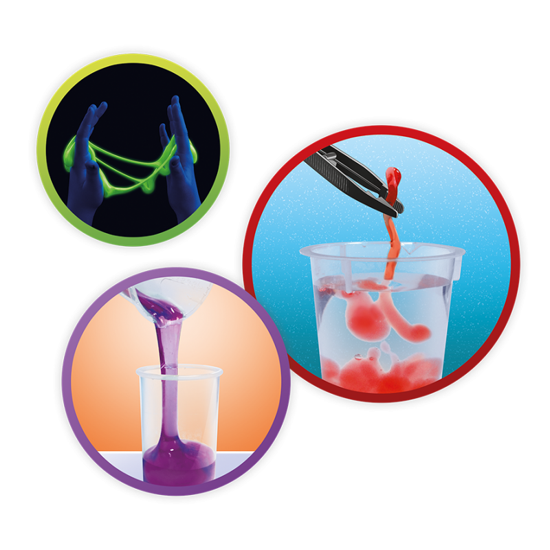 ërfshihet: 50 ml gotë, 100 ml gotë, 4 enë, 1 lugë matëse, 3 përzierës, 1 pipetë, 1 palë piskatore, 1 kallëp topi, 1 tullumbace, 1 gyp, 1 mermer, 1 epruvetë me mbajtëse, 15 bustina zhul standard, 5 bustina zhul ultra rrëshqitës, 3 ngjyrosje (blu, e kuqe dhe e verdhë), 1 ngjyrosje fluoreshente, 1 shishe shkëlqim blu, 1 shishe shkëlqim ari, 1 shishe pluhur fosforeshent, alginat natriumi, laktë kalciumi, fletë e ilustruar.