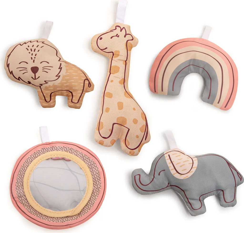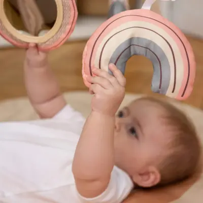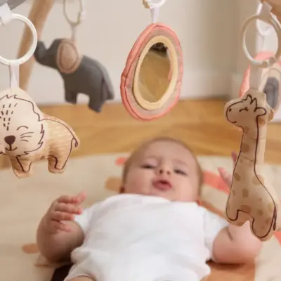 Falë harqeve të qëndrueshme dhe fleksibël dhe pozicionimit optimal të varëseve të harkut të lojës, batanija e aktivitetit Hakuna Mat mbështet zhvillimin e muskujve të bustit dhe qafës, aftësitë motorike dhe koordinimin sy-dorë.