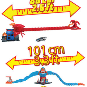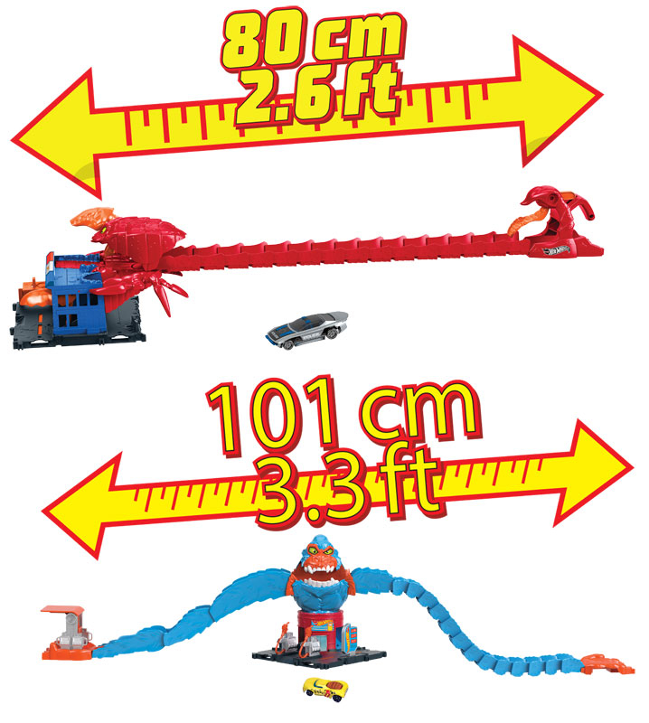 Ky koleksion kombinon shpejtësinë dhe marifetet klasike Hot Wheels me pengesa emocionuese me temë krijesash që shtojnë një kthesë të freskët në lojën tradicionale të pistës së makinave.