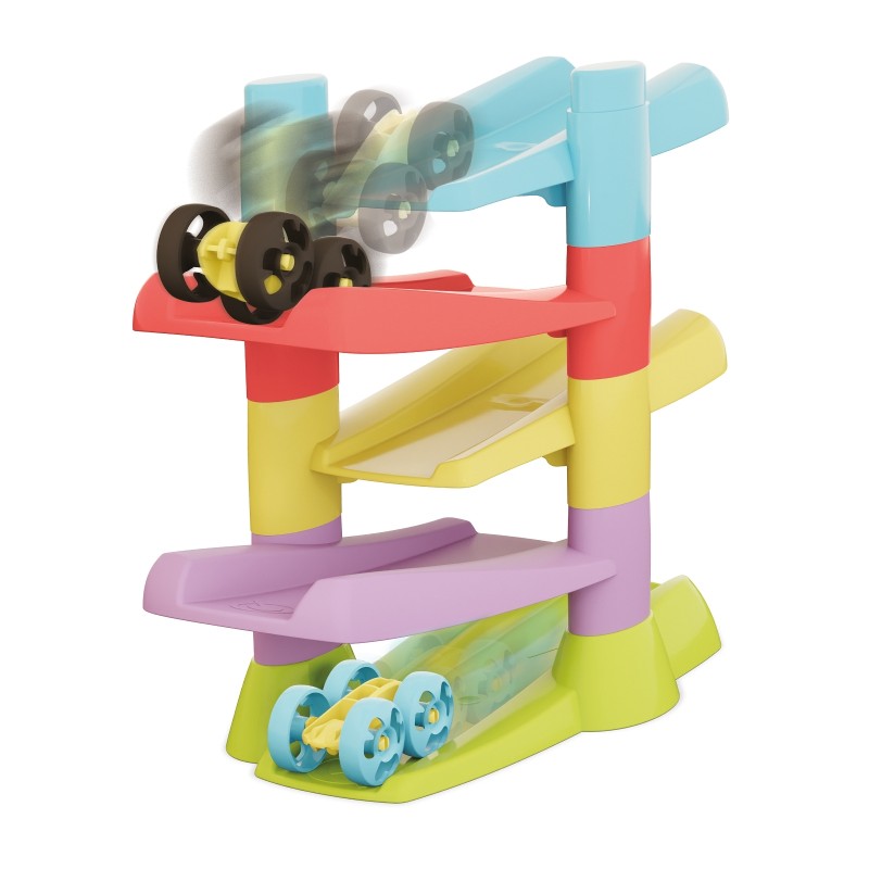 Ky qark shumëngjyrësh përbëhet nga 5 rampa të grumbulluara dhe 2 makina inteligjente që rrotullohen në fund të çdo zbritjeje… pa e ndërprerë kurrë kursin e tyre!
