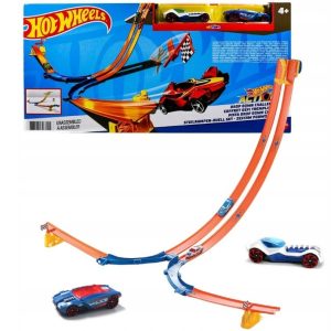 Ju do të filloni argëtimin e çmendur sapo të hapni paketën do të gjeni gjurmë portokalli, qoshe fasha të zeza, lëshues blu, flamuj për të shënuar vijën e finishit, rampa lundruese dhe një makinë lodër Hot Wheels.