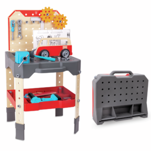 • SHUMË PJESË: Kjo tavolinë pune përfshin një çekiç, një stërvitje elektrike, një sharrë, një vidë stoli, 2 ingranazhe, një katror L, një çelës, një kaçavidë, një matës shiriti, 4 goma, 2 trupa makinash, një skenë garazhi kartoni dhe disa arra dhe bulona.