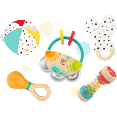 Zbuloni Hape 5in1 Baby Sensory Set, një grup loje i mahnitshëm që përfshin tamburin, zhurmë, top, unazë dhe krijues shiu.