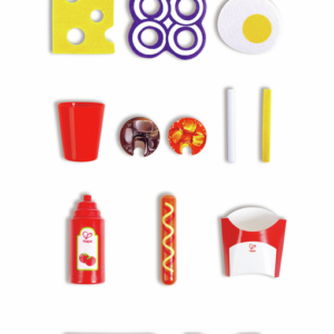 Kjo komplet darke e stilit amerikan përfshin një menu plus një hamburger realist, hotdog, patate të skuqura dhe kola.