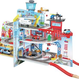 Përfshin një bazë lojërash me tre shtresa, tre shkallë, një aeroplan, një ashensor, një kamion, një bllok mallrash, tre karroca, një korsi porte, një stacion policie, një hekurudhë plastike të lakuar, katër shina ngjitjeje plastike, një disk transmetimi bagazhi i rrotullueshëm, katër figura, një portë ngritëse, katër seksione rruge, një kullë vrojtimi, një kuti veglash me katër mjete, një vinç, tre skela, një pemë, dy porta dhe një shenjë transporti.