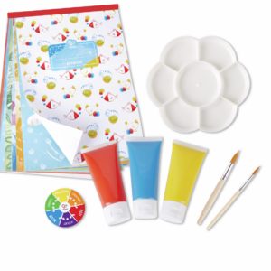 SHUMË PJESË: Ky set përfshin tre tuba bojë 60 ml, një paletë, një rrotë ngjyrash, tre furça, një album aktiviteti A3 dhe një kapëse lidhëse.