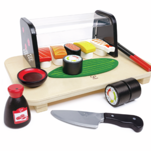 Shtoni salcën e sojës dhe wasabi për shije! Përfshin një tabaka, një dritare, një pjatë me wasabi, një shishe salcë soje lojë, një palë shkopinj, një thikë loje, gjashtë copa sushi dhe një rrotull algash deti.