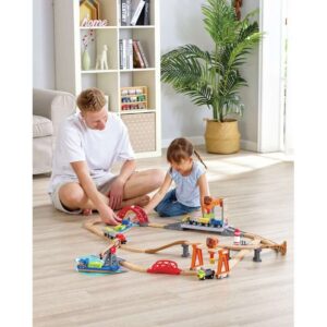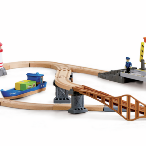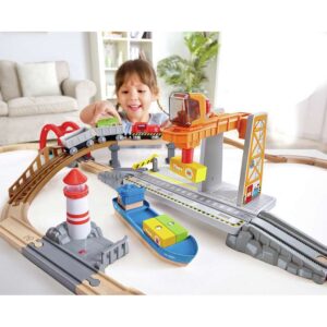 Zbuloni mrekullitë e trenave të mallrave me setin e transportit të mallrave detare dhe hekurudhore! Transportoni ngarkesa nga anijet në trena, ngrini urën dhe ndizni farin. Shijoni efektet zanore si bilbilat e trenit dhe valët e oqeanit. E përputhshme me grupet e tjera hekurudhore Hape, është e përkryer për lojë imagjinative dhe zhvillim të aftësive.