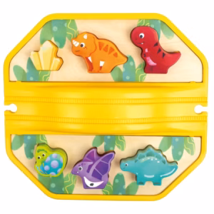 NDARËS FORMASH: Kapaku i setit është i pajisur me hapësira në formë dinosaurësh, në të cilat mund të futen blloqet – një aktivitet shtesë që gjithashtu nxit aftësitë e zgjidhjes së problemeve.