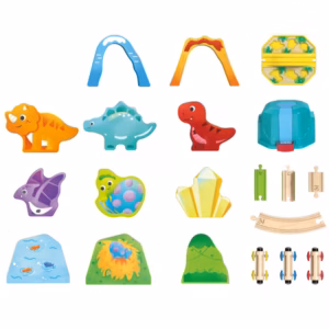 SHUMË PJESA: Paketimi përfshin një kuti ruajtjeje, một mbulesë, një shina të drejtë e mbuluar me stof (10 cm), një shina të drejtë (5 cm), një shina me efekt zanor, tetë shina të mëdha të përthyera, dy pjesë prej tulla druri, dy blloqe tuneli, një bllok mali, tre vagonë, pesë blloqe dinosaurësh dhe një bllok diamanti.