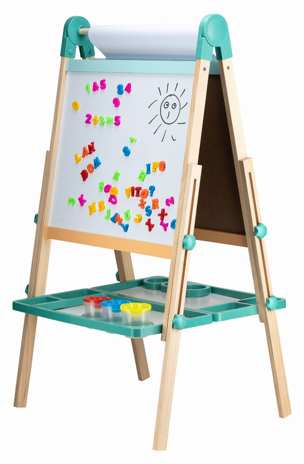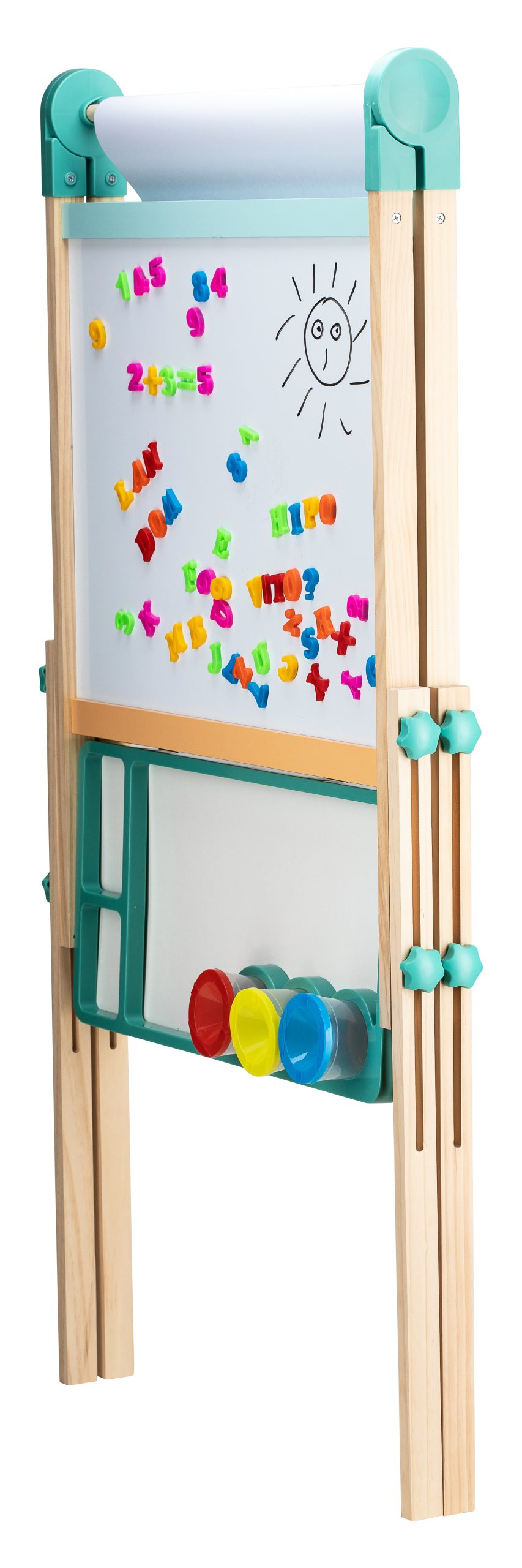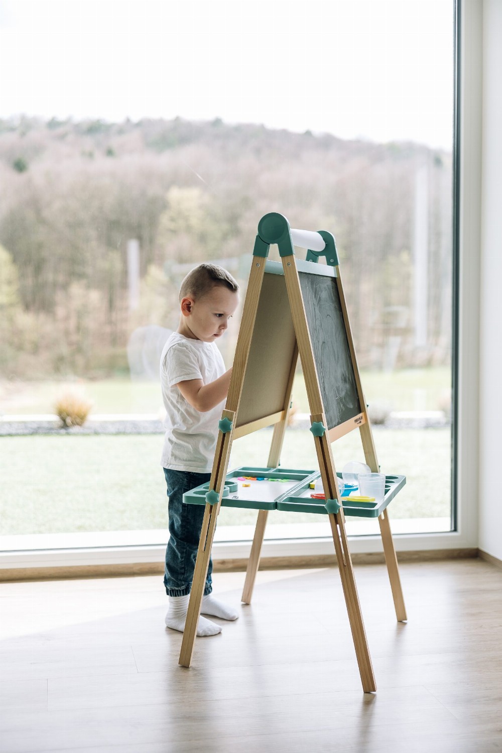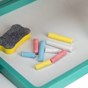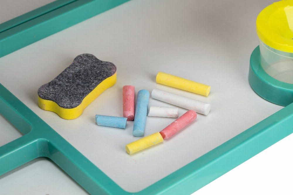 Tabela përmban dy anë të përdorshme – njëra e projektuar për vizatim me shkumës dhe tjetra për të shkruar me një shënues në tabelë ose në letrën e përfshirë, si dhe për të luajtur me shkronjat dhe numrat magnetikë.