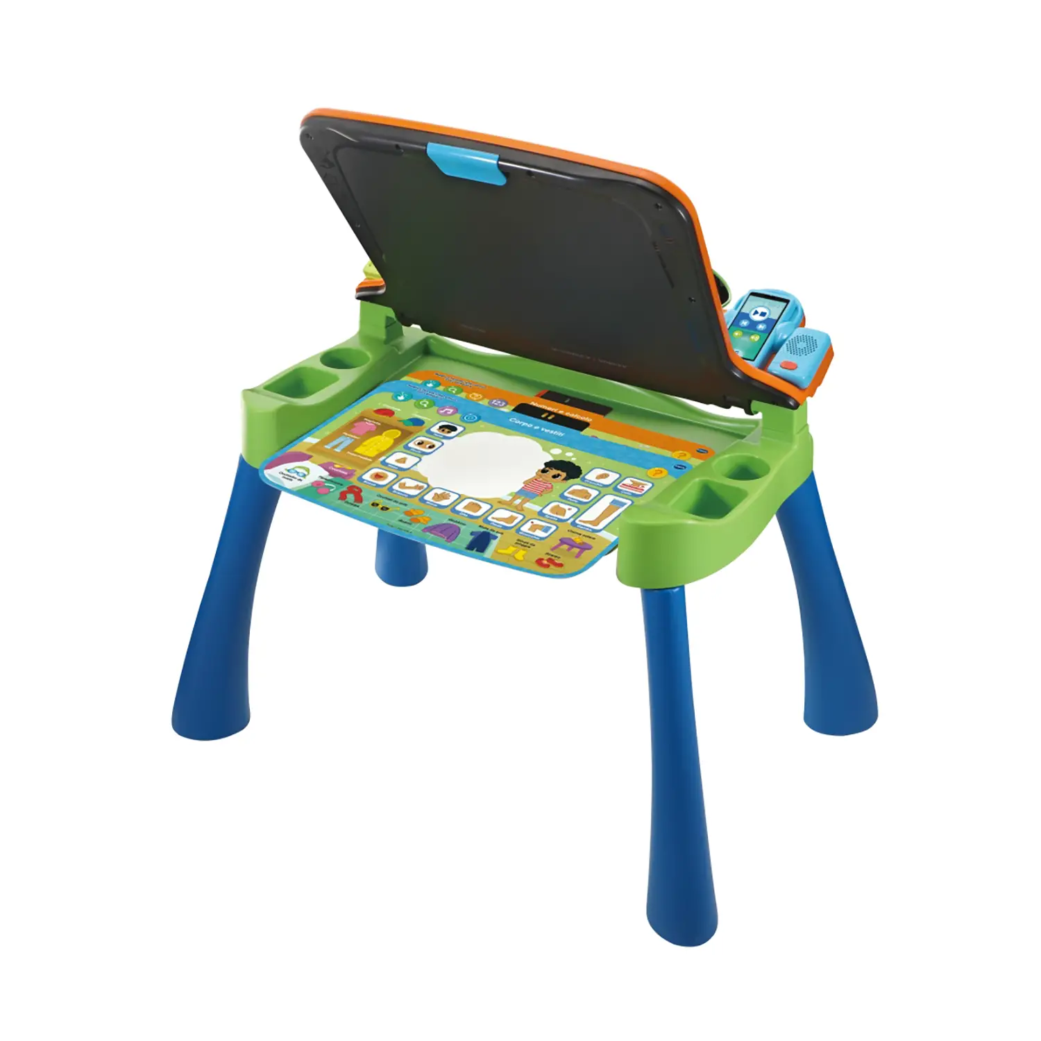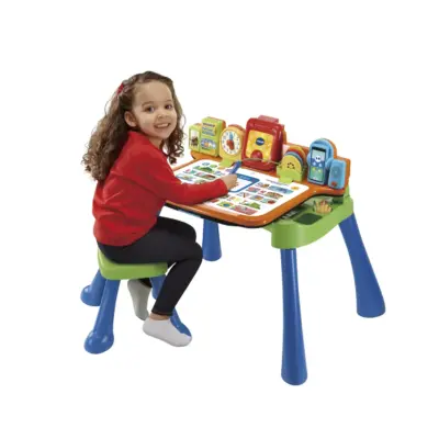 Katër kartat interaktive mund të ruhen rehat brenda tavolinës, duke mbajtur gjithçka të organizuar. Tavolina është e pajisur me një mbajtës lapsash/gishte dhe me një stol, duke ofruar gjithçka të nevojshme për orë lojë dhe mësimi në mënyrë të organizuar.