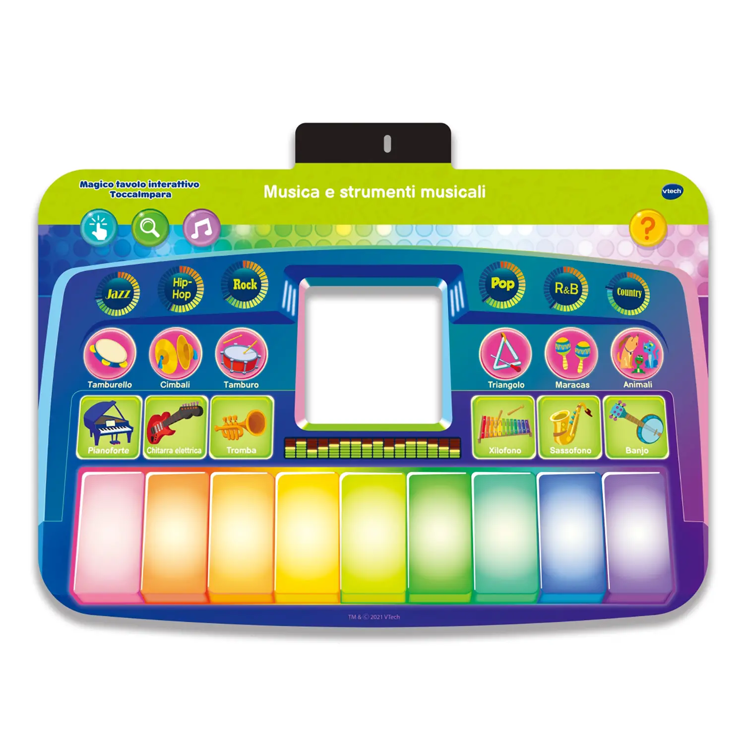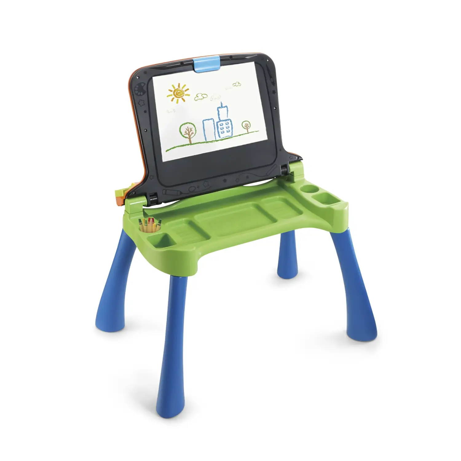 Stativa e integruar është perfekte për të varur fletët e vizatimit, ndërsa tabla ofron një sipërfaqe shtesë për të vizatuar me gishta krep. Zërat dhe animacionet në ekran aktivizohen kur fëmija prek kartat interaktive, duke bërë përvojën edhe më të angazhuar.