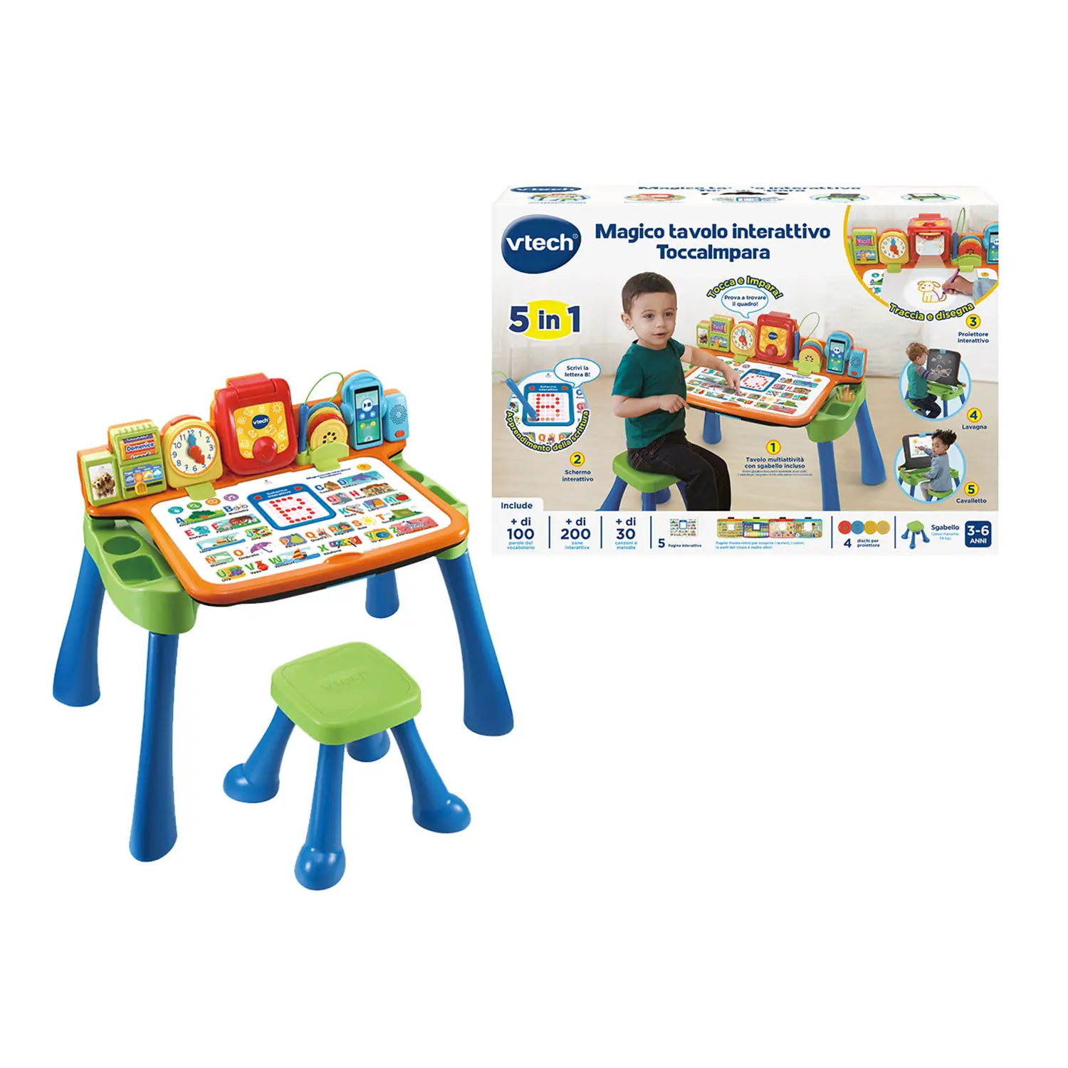 VTech Tavolina Magjike Interaktive PrekDheMëso përfshin 4 disqe për të hedhur 28 imazhe, duke ndihmuar fëmijët të mësojnë të vizatojnë dhe të eksplorojnë tema si alfabeti dhe numrat. Një përvojë mësimore interaktive dhe argëtuese që nxit kureshtjen.